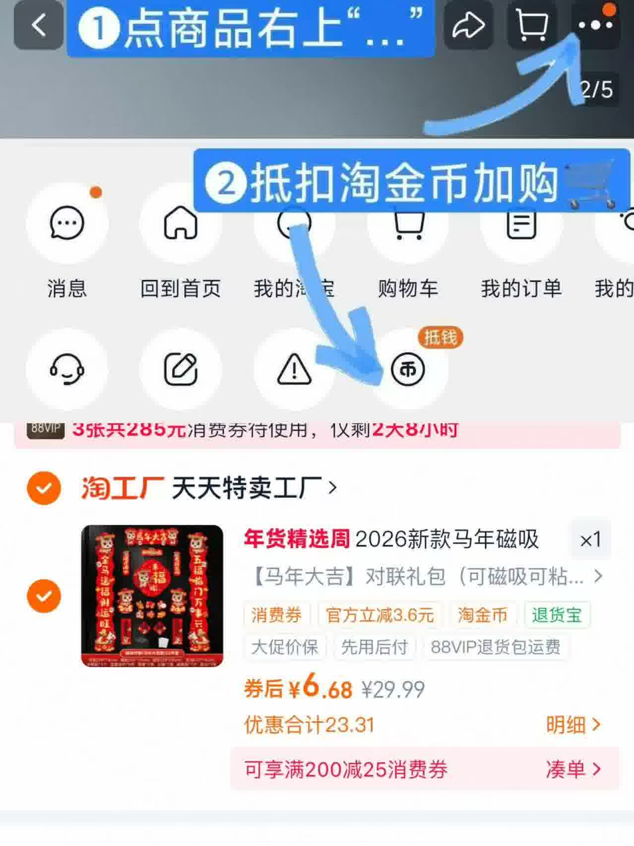 第一 领券后,从右上角“…”,进淘金币抵扣