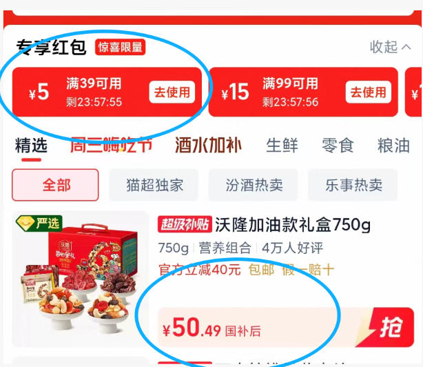 第一 下拉详情“超级补贴” 进去,自动跳转领39-5红包,叠国补